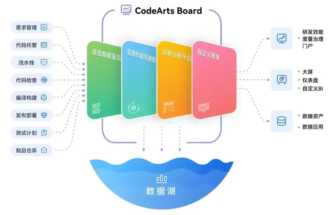 华为云CodeArts Board能够自动集成CodeArts工具链数据,覆盖工作项、需求、缺陷、代码、构建、代码检查、测试、流水线、部署及发布领域,连接数据孤岛,实现对研发全生命周期的可视化可管理可评估。