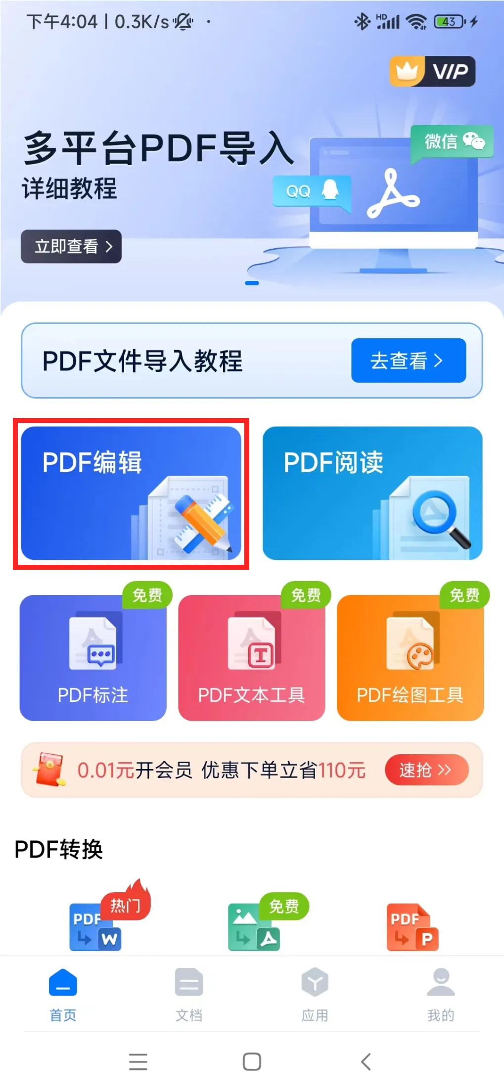 打开软件后,选择首页的“PDF编辑”功能,在文档库里导入需要编辑的PDF文件。