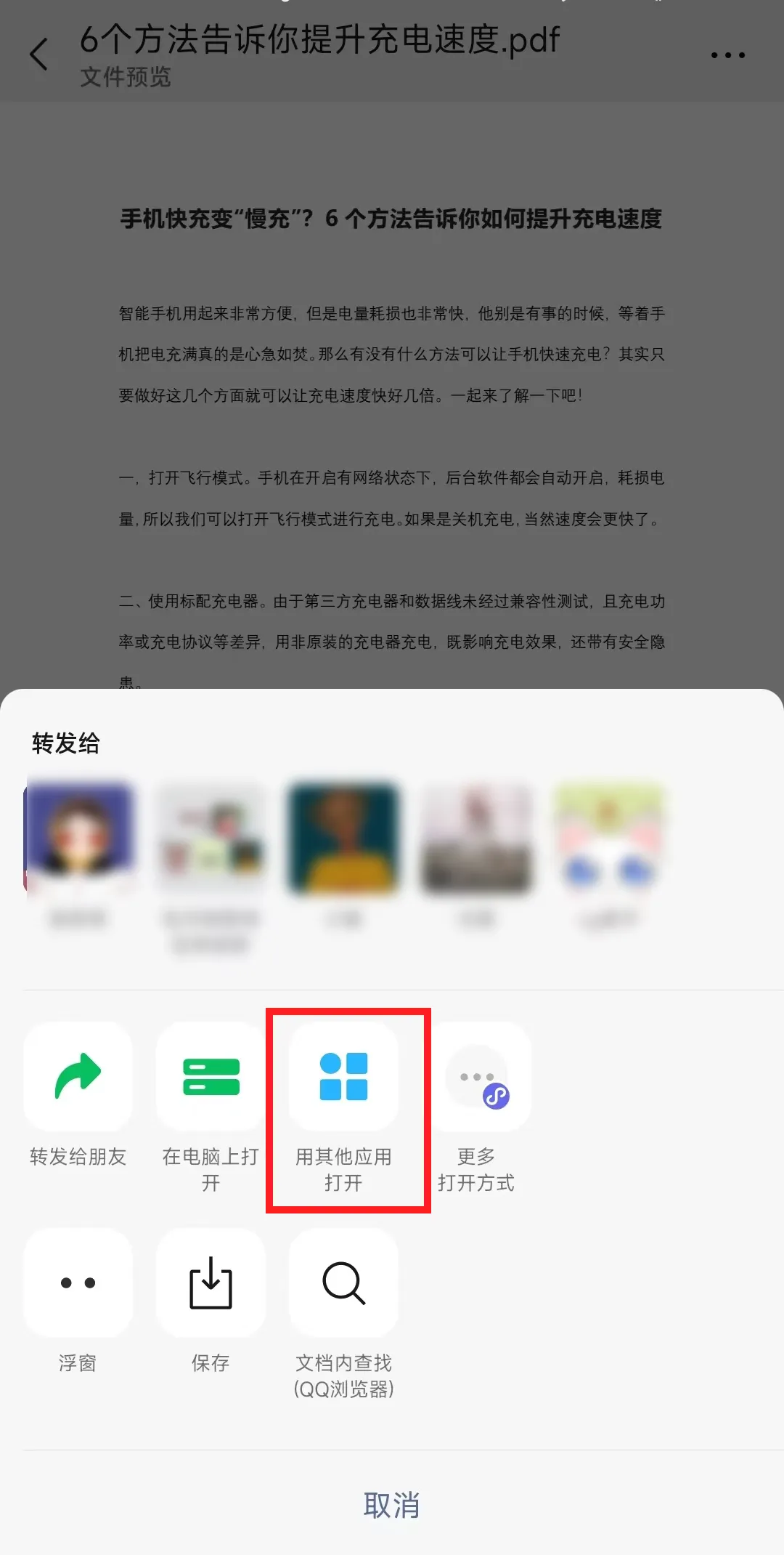 注意啦,如果文档库里没有文件,则需要在其他APP中找到需要操作的文件,选择“其他应用打开”-“迅捷PDF编辑器”,点击后成功跳转,即可开始处理。