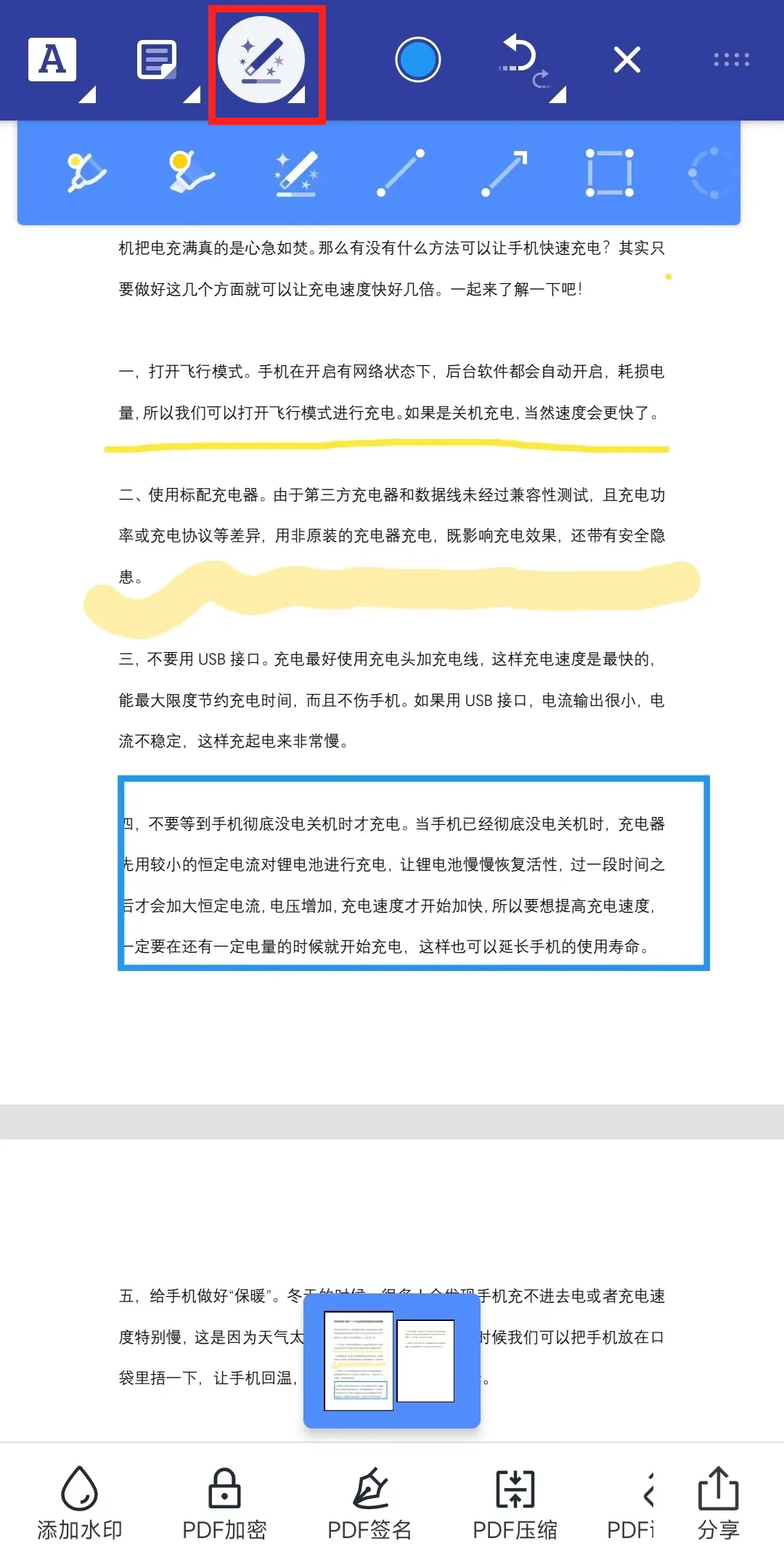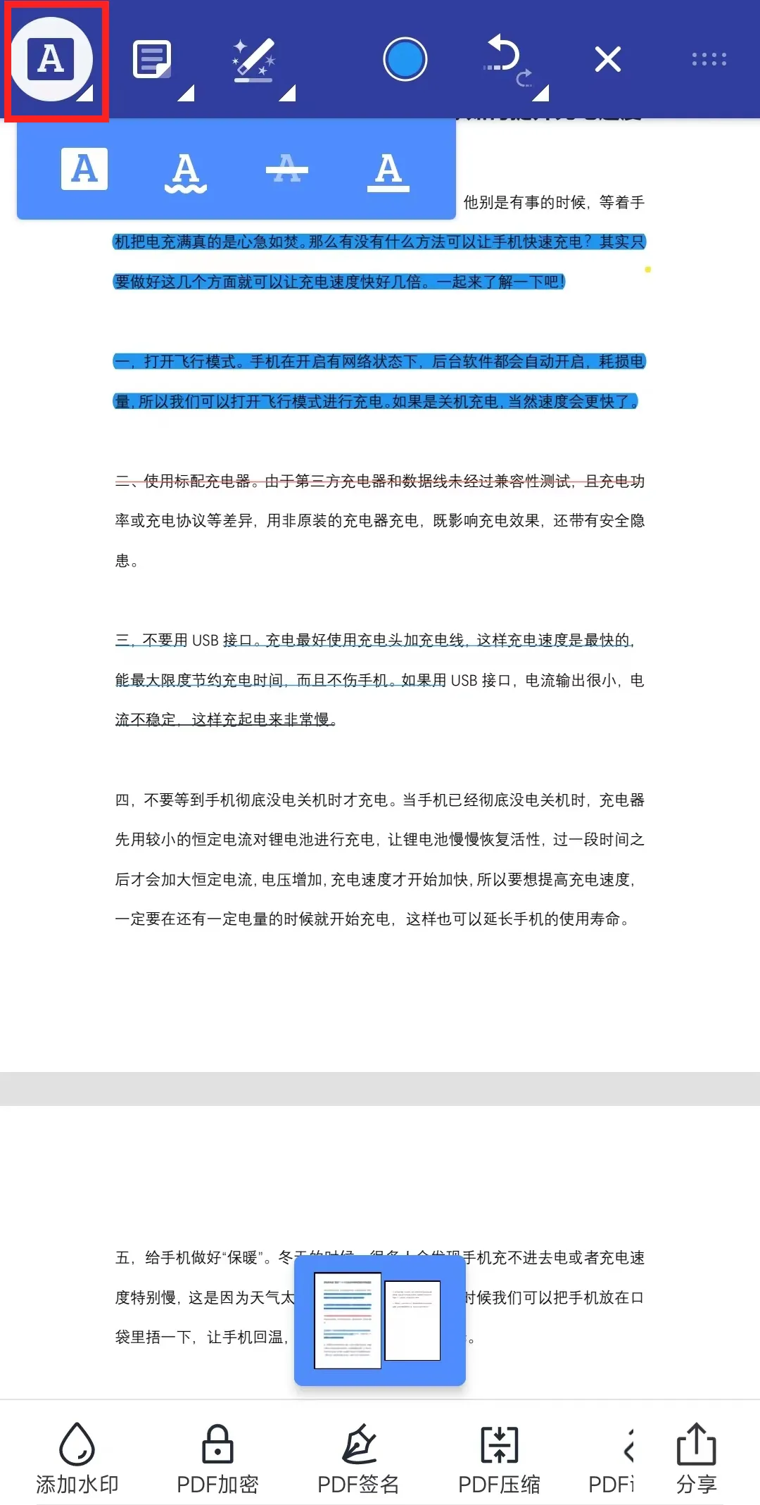 可以看到,在页面的左上角有三种PDF编辑功能。长按文字编辑功能,在这里我们可以为文字标注下划线、删除线或用荧光笔提亮!