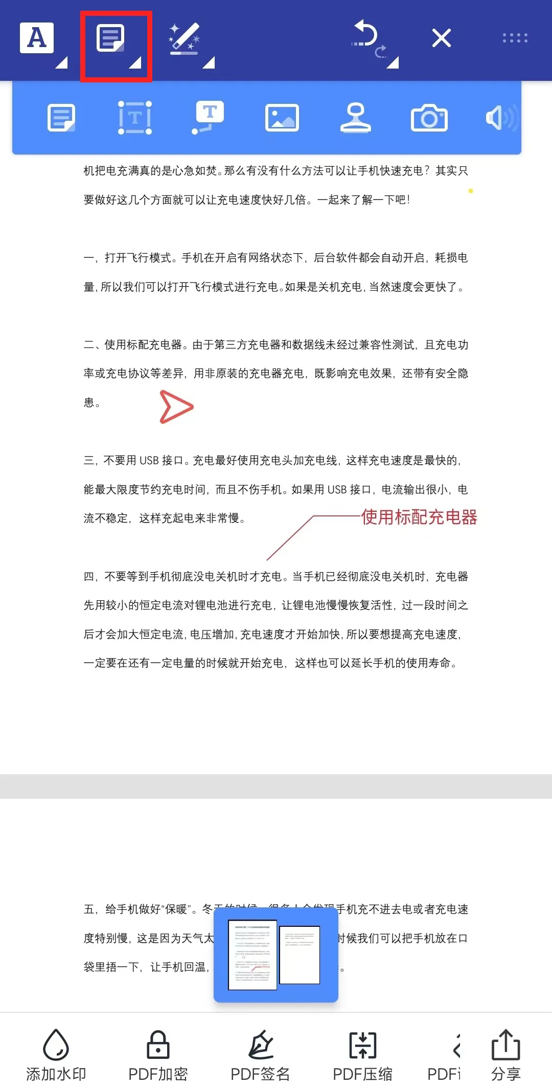 长按第二个图标,可以为PDF文件添加注释、图片、文本框、印章等内容,满足各种编辑需求!