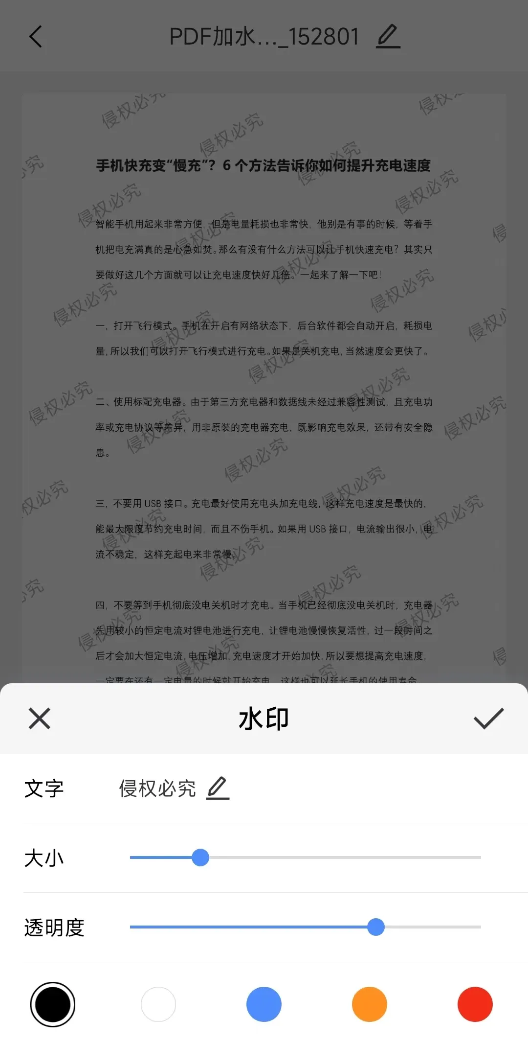 水印文字可以自由填写,大小、颜色以及透明度也能根据需求自行调节。这样,再也不怕文件被人盗用了!
