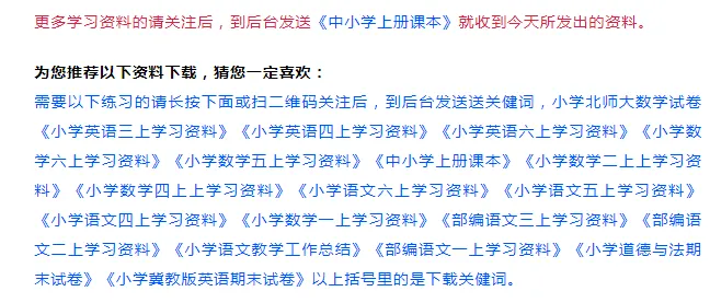 需要以下练习的请长按下面或扫二维码关注后,到后台发送送关健词,小学北师大数学试卷《小学英语三上学习资料》《小学英语四上学习资料》《小学英语六上学习资料》《小学数学六上学习资料》《小学数学五上学习资料》《中小学上册课本》《小学数学二上上学习资料》《小学数学四上上学习资料》《小学语文六上学习资料》《小学语文五上学习资料》《小学语文四上学习资料》《小学数学一上学习资料》《部编语文三上学习资料》《部编语文二上学习资料》《小学语文教学工作总结》《部编语文一上学习资料》《小学道德与法期末试卷》《小学冀教版英语期末试卷》以上括号里的是下载关健词。