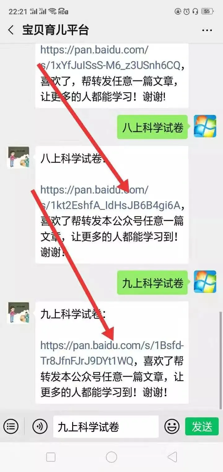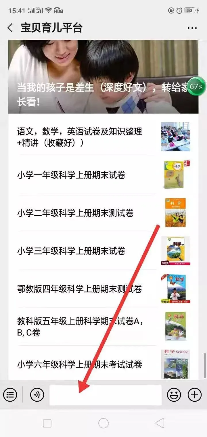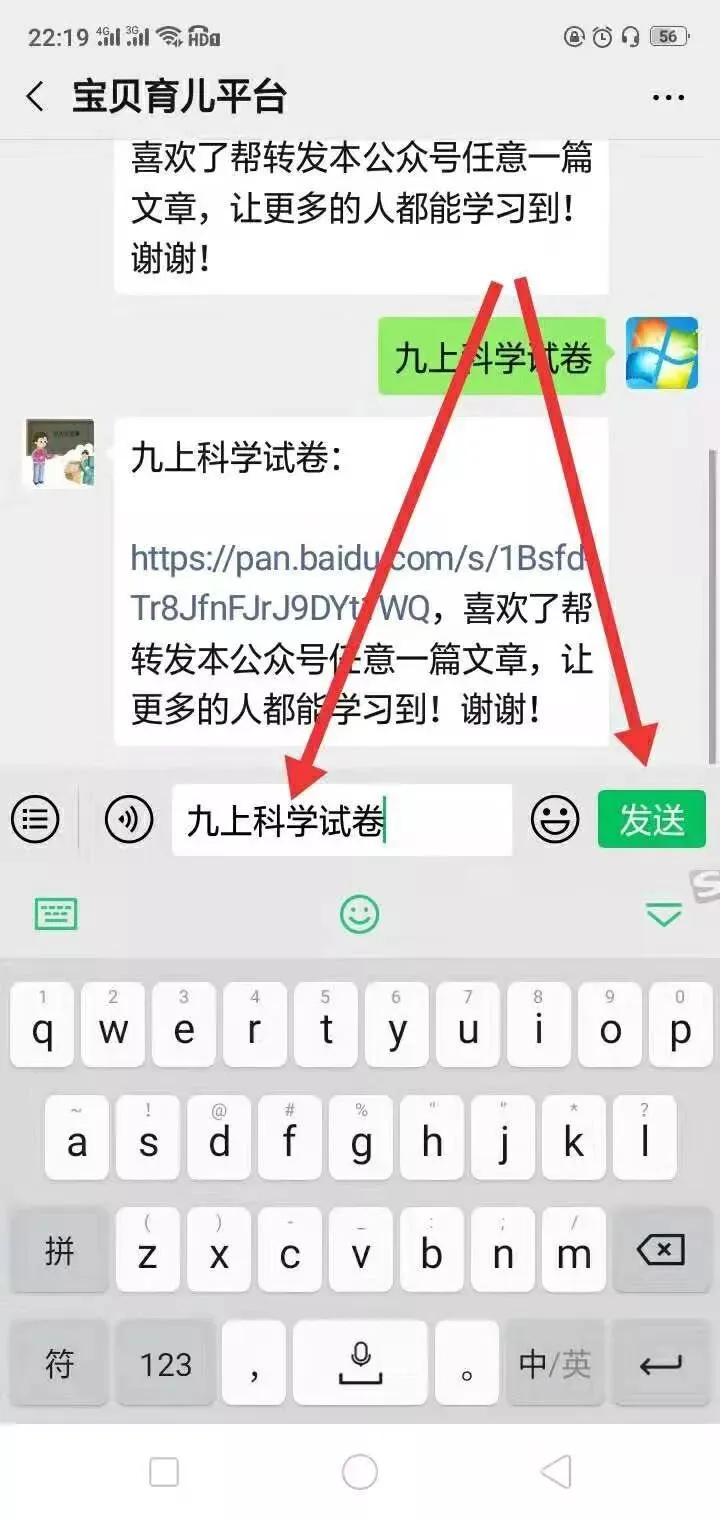 一,我们先到文章末尾找到要输入什么样的关健词,如:二年级上册科学的试卷,就这篇文章末尾找到如下的关健词《二上科学试卷》,关健词不包括括双号在内啊,的上关健词后,复制粘贴到我们公众号后消息发送框,发送给我们,就会马上回复您一个链接下载地址, 这样就可以下载了,每次都要找到文章,再找双括号里关健词的哦!