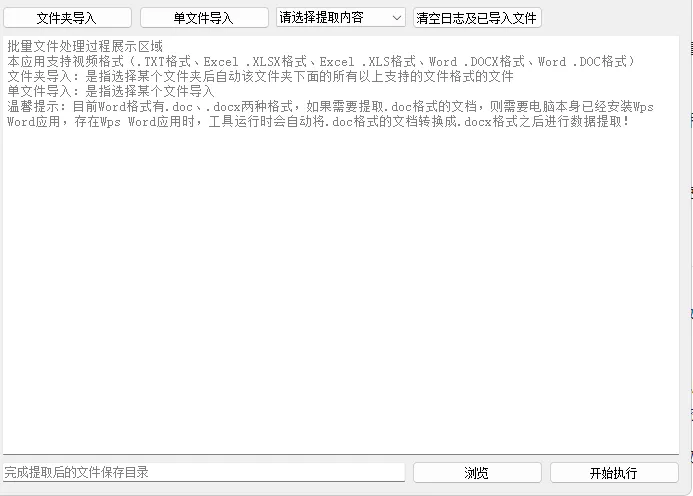 温馨提示:目前Word格式有.doc、.ocx两种格式,如果需要提取,doc格式的文档,则需要电脑本身已经安装WpsWord应用,存在Wps Word应用时,工具运行时会自动将.doc格式的文档转换成.docx格式之后进行数据提取!