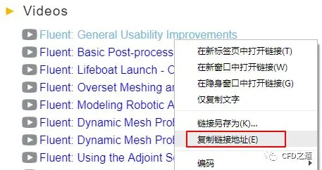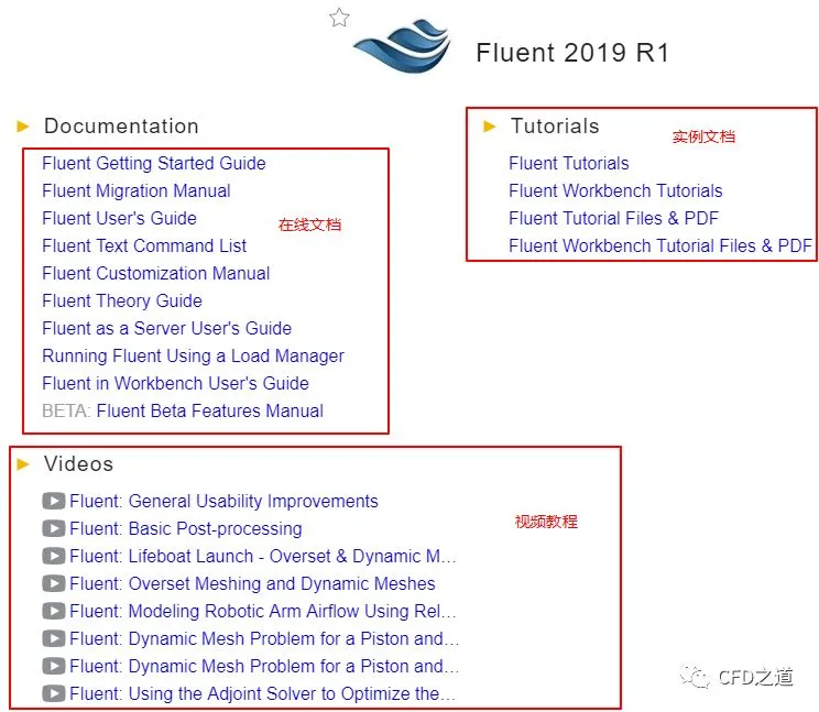 如下图所示为点击列表项Fluent后显示的文档内容。用户可以选择各种在线文档查看,也可以下载Tutorials文档以及案例文件。不过要想查看视频教程则比较麻烦。这些视频都被放在了油管上,没有梯子是看不了的。