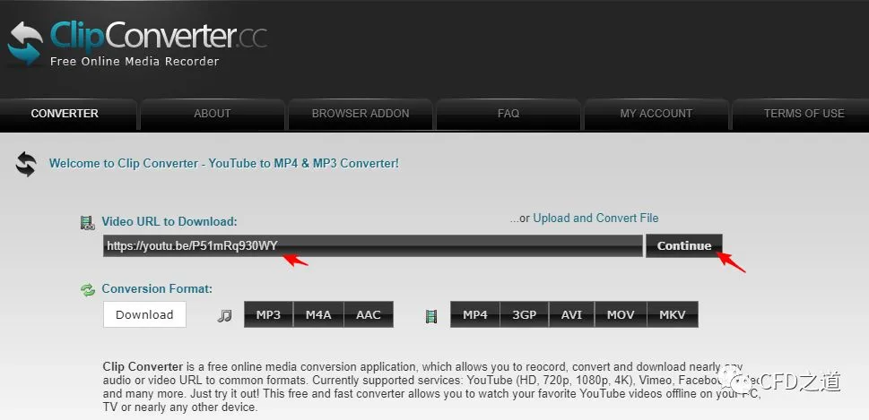 进入网站https://www.clipconverter.cc/,将链接拷贝到输入框中,点击按钮Continue
