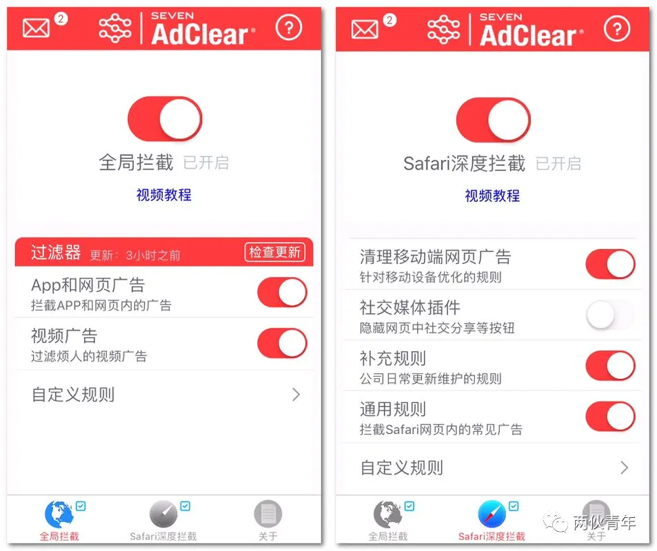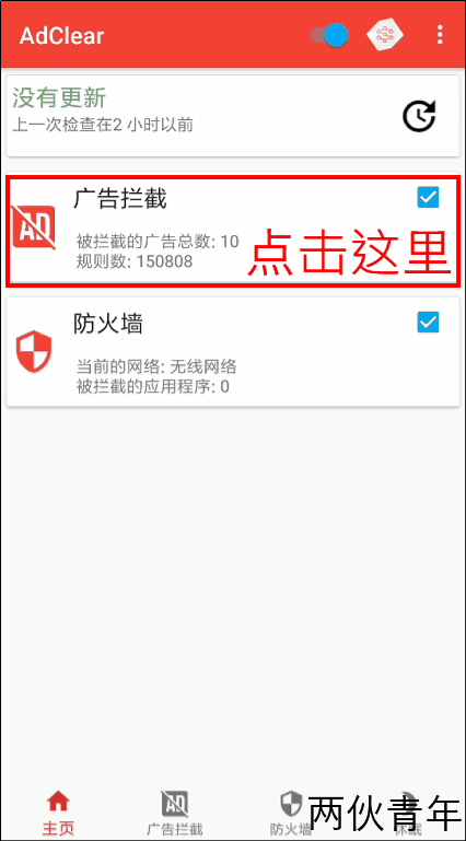 安卓版本的设置相较于苹果版有一些麻烦,除了像下图中勾选选项外,我们还需要到“广告拦截”中自定义要拦截的软件。