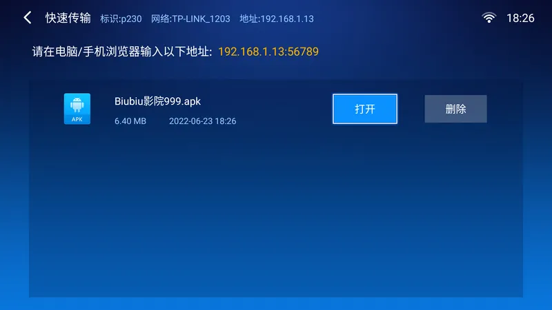 手机和电视链接同一WiFi的情况下,手机输入电视端提示的网址,点击上传即可将手机里的app发送到电视。