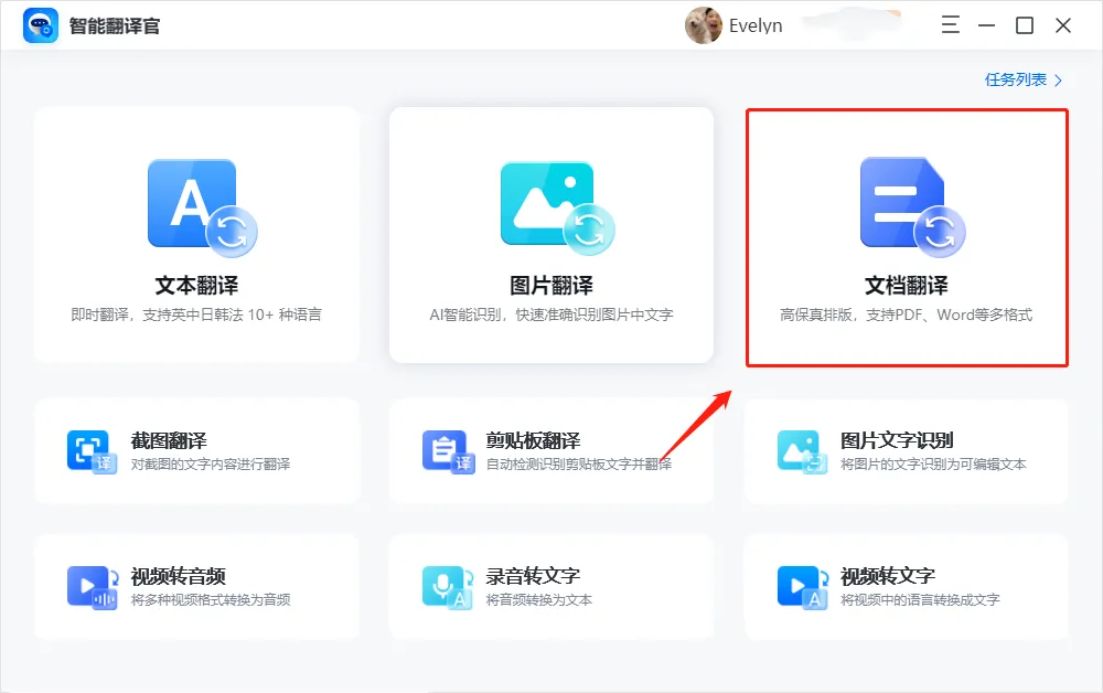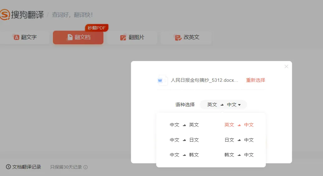 同样是先找到翻文档功能,这里同样是支持PDF、Word、PPT等多种格式,将我们需要翻译的PDF文档直接拖入。