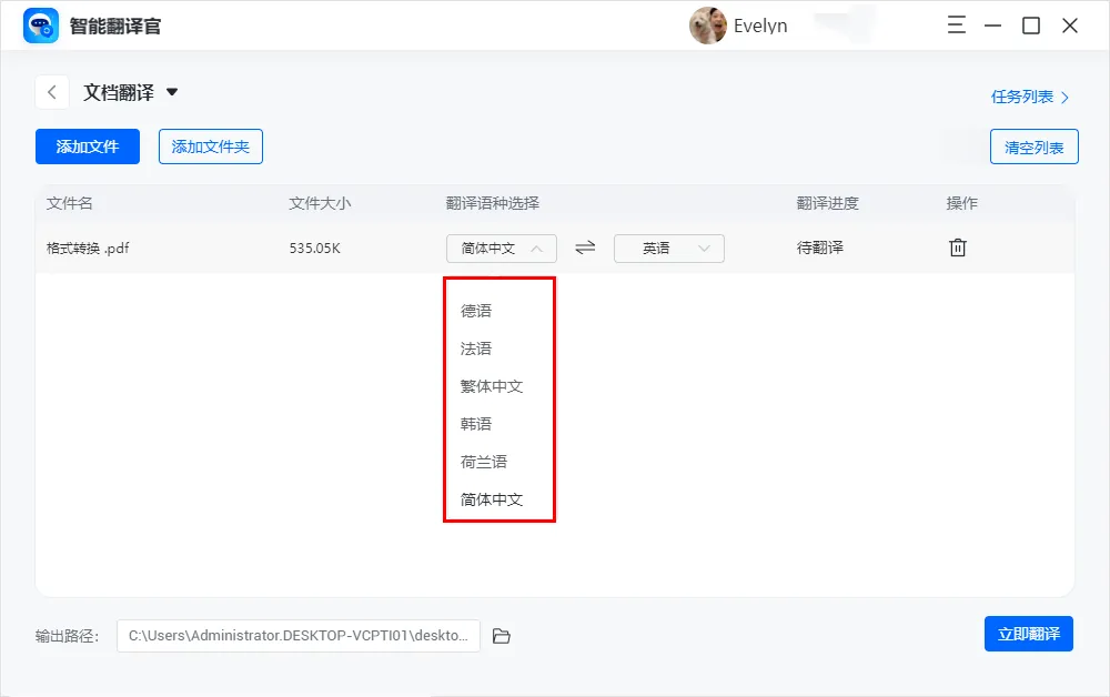 像咱们今天说的要翻译整个PDF文档,只需要打开软件后,选择【文档翻译】功能,上传需要翻译的文档,当然啦,不仅限于PDF文档。Word、Excel等它都支持。如果有多份文档需要翻译,还能批量添加同时处理,简直是效率利器。