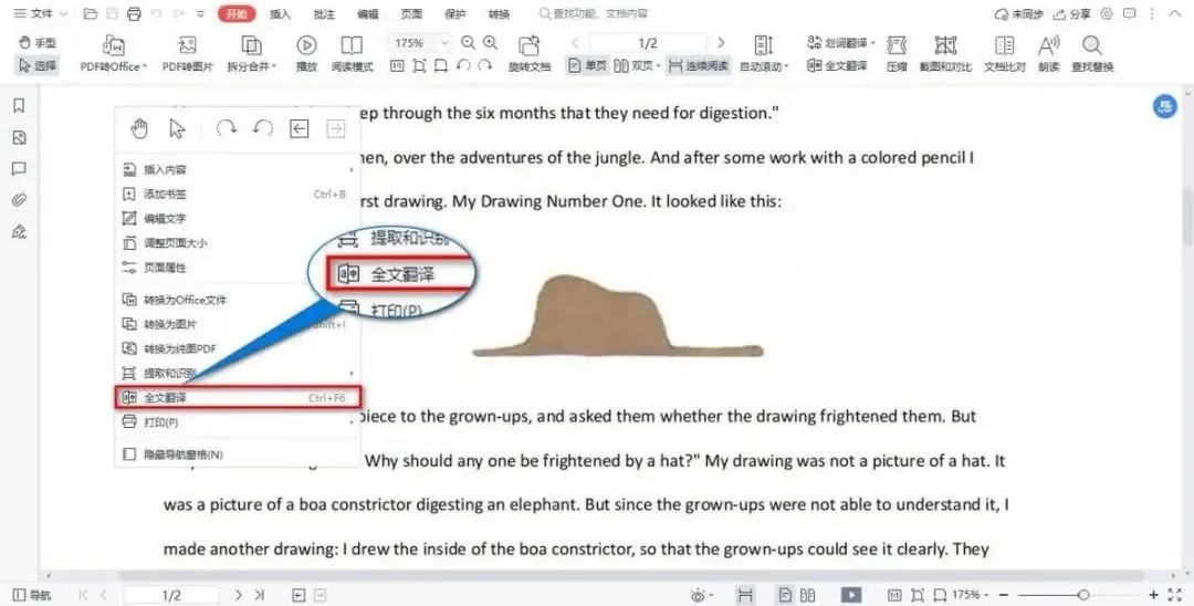 在wps中打开PDF文件,页面里单击右键打开功能面板,选择全文翻译。