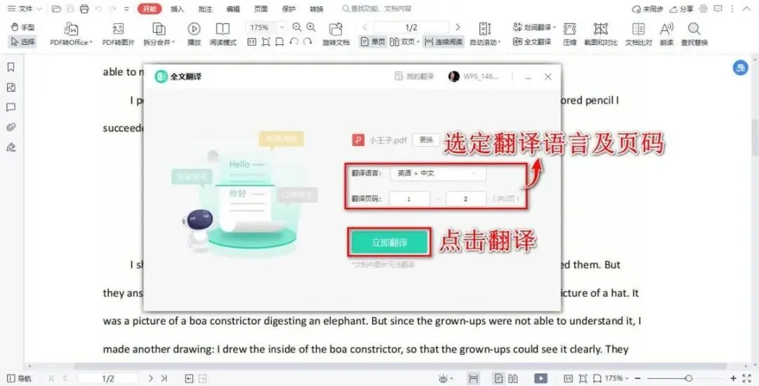 在对框中选择所需语言(默认为英汉互译)及翻译页码,点击翻译即可啦!