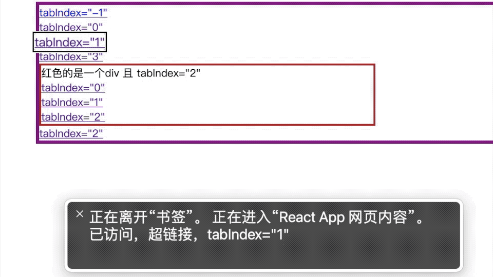先将所有的 tabIndex=”1″的元素,按照 DOM 树的顺序依次对焦后,再去对焦 2、3 最后对焦 0 。-1 的元素无法使用 tab 键进行对焦。