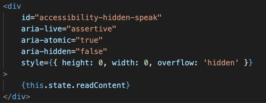 最后,这个存储用户操作结果的节点放到哪里呢?放到一个用户看不到的隐藏 dom 节点里,一个专门为读屏软件而创建的隐藏 dom 节点。详细代码如下所示:
