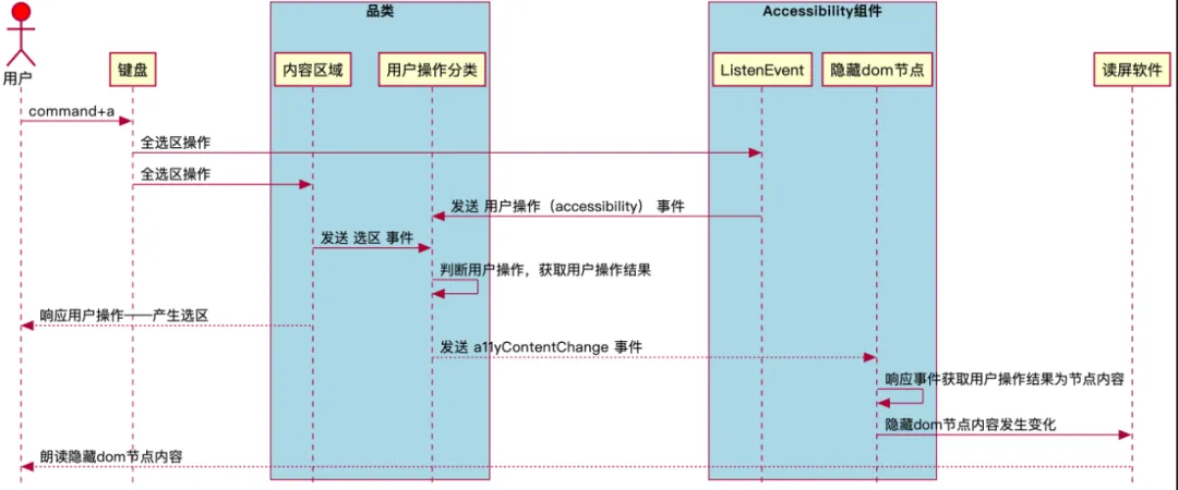 用户操作在内容区域,对用户操作事件进行类型划分,同时按照流程上的内容变动、产生选区、光标移动的优先级,进行内容获取。再传递给读屏软件进行用户操作结果朗读;