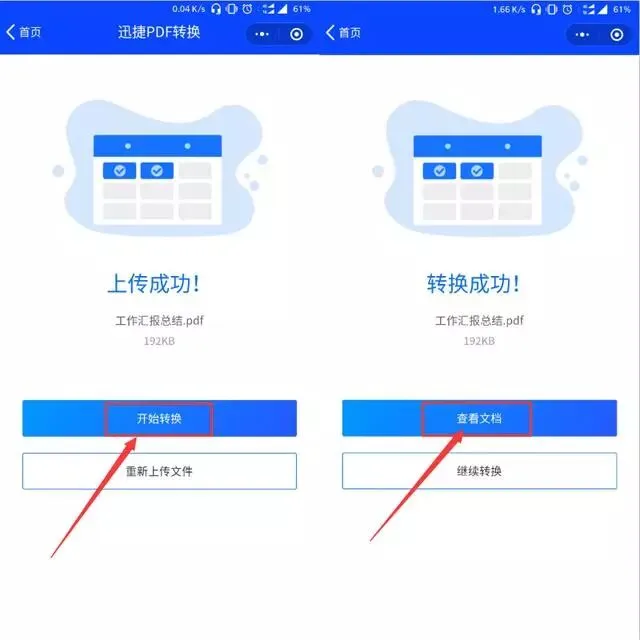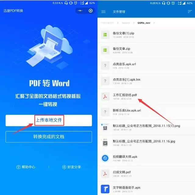 1:点击小程序首页【上传文件】,选择手机文档管理里面需要转换的PDF文件,即可上传文件成功!