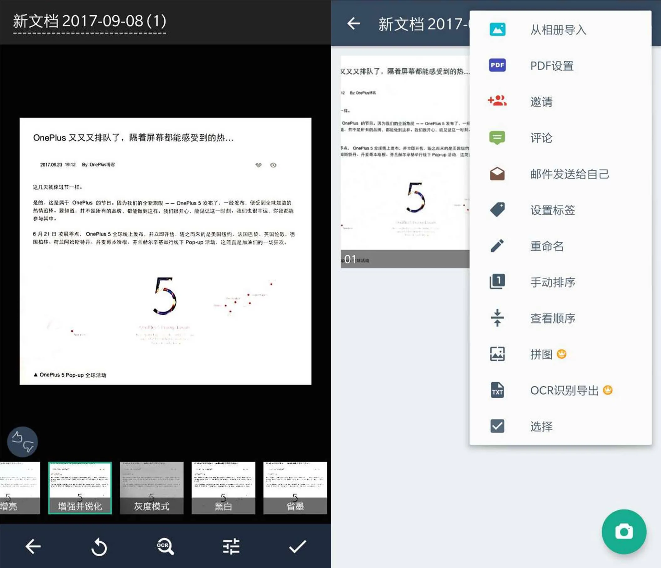 想过你的 OnePlus 会变成扫描仪么?只要用手机拍下照片,就能自动生成为高清的pdf、jpeg或pdf文档。期间,你可以对拍下的照片进行裁剪,调节照片的亮度、对比度等等。一切就绪后,打印、传真、甚至是微信分享,都能够轻易实现。而这些只要几秒钟就能够实现,真的很黑科技!
