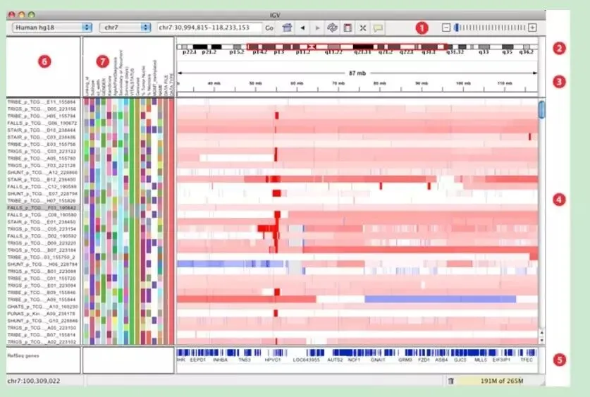 该窗口显示测序样品的测序情况。每一条track代表一个样品或者一次实验,显示的情况包括甲基化、表达水平、拷贝数,碱基突变等信息。