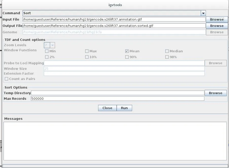 提示需要index,点击Go后又提示该GTF文件没有排序,按照提示给出的说明,打开Tools—-Run igvtools 在新打开的面板中选择“sort”,并选择 gencode . v26lift37 . annotation . gtf,点击Run。