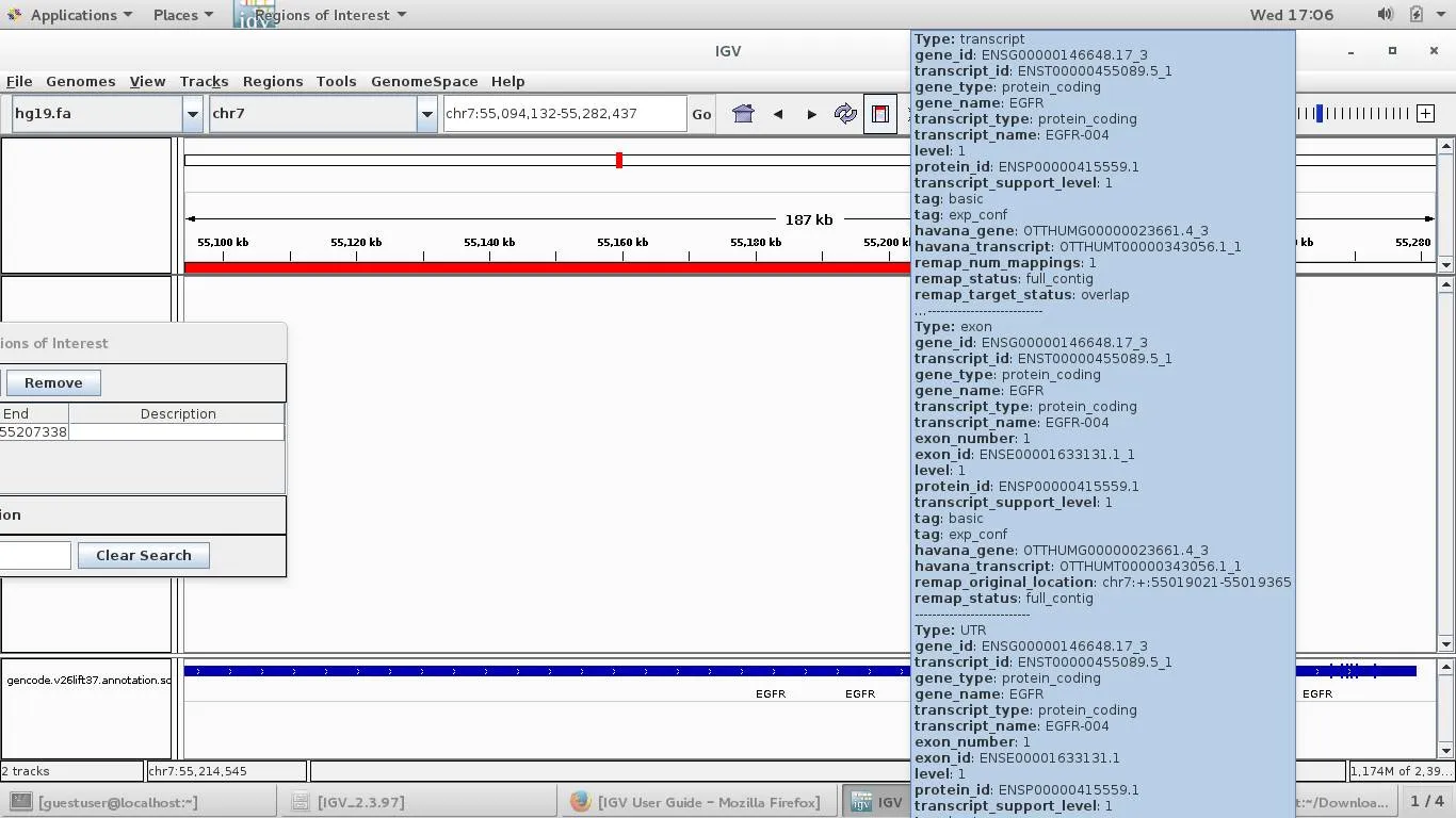 比如EGFR的location是chr7:55019032-55207338,在IGV的工具栏中GO前面的输入框中输入“ chr7:55019032-55207338 ”即可查看该基因的结构