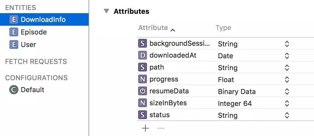 为了实现上述功能,我把该状态保存成 Core Data 模型。我的 DownloadInfo 模型如下所示: