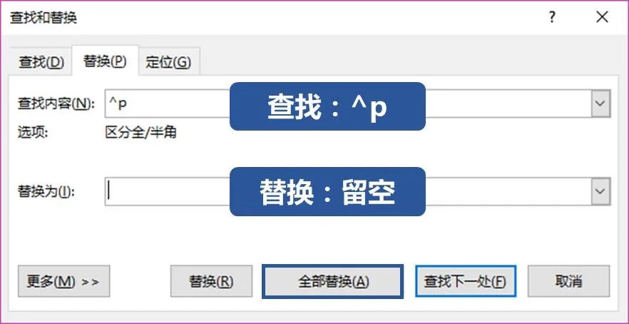 熟悉往期推送的小伙伴,立马想到查找替换解决断行的问题,选中这段内容,然后按 【Ctrl + H】,打开替换对话框,把 ^p 全部替换成无即可。