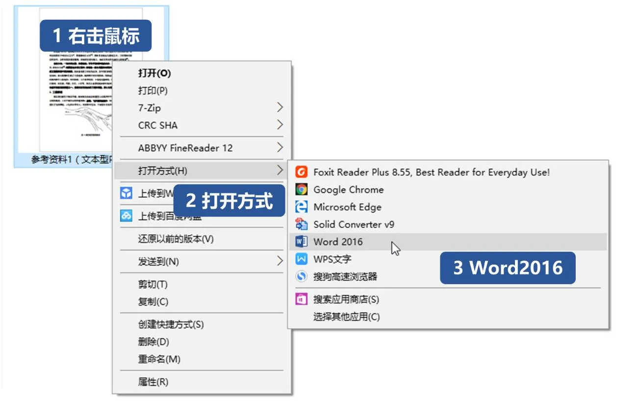 Word 的确可以转换 PDF,但必须是 Word2013 及以上版本。你要做的就是选中想要转换的 PDF 文档,右击鼠标选择用 Word2013或2016 打开。