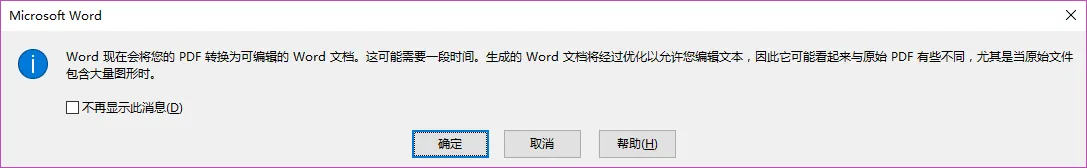 这个时候 Word 友情地提示你,它正在努力地转 Word,但转换之后可能会和 PDF 有点差异,没事,点确认就行。
