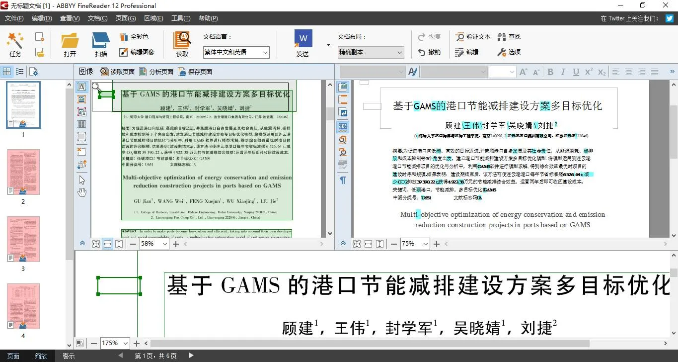 在转换完成后的界面分成三块,左侧为 PDF 全局视图,右侧为转换成的 Word 窗口,其中疑似错误的文字会标蓝,下方为对应的 PDF 放大视图。