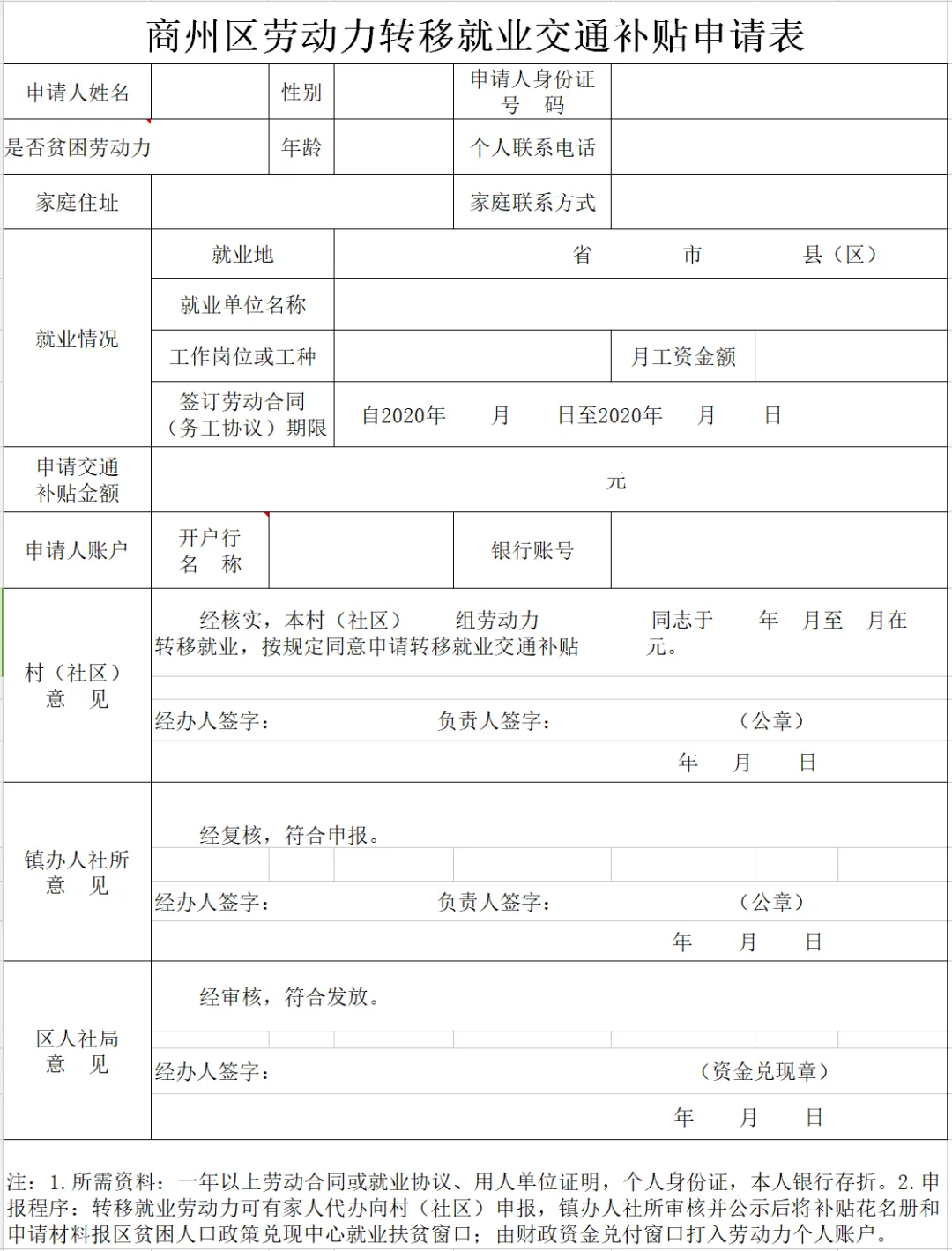 (一)办理要求。今年所有自行外出就业者,不提供车票。但必须提供一年以上的劳动合同(聘用协议或用人单位出具的务工证明,拍照片发回即可),稳定就业3个月以上的申报不超过定额标准的转移交通补贴。贫困劳动力在申请转移就业交通补贴的同时,一套资料可同时申请500元的一次性求职补贴(另行填写一次性求职补贴申请表)。