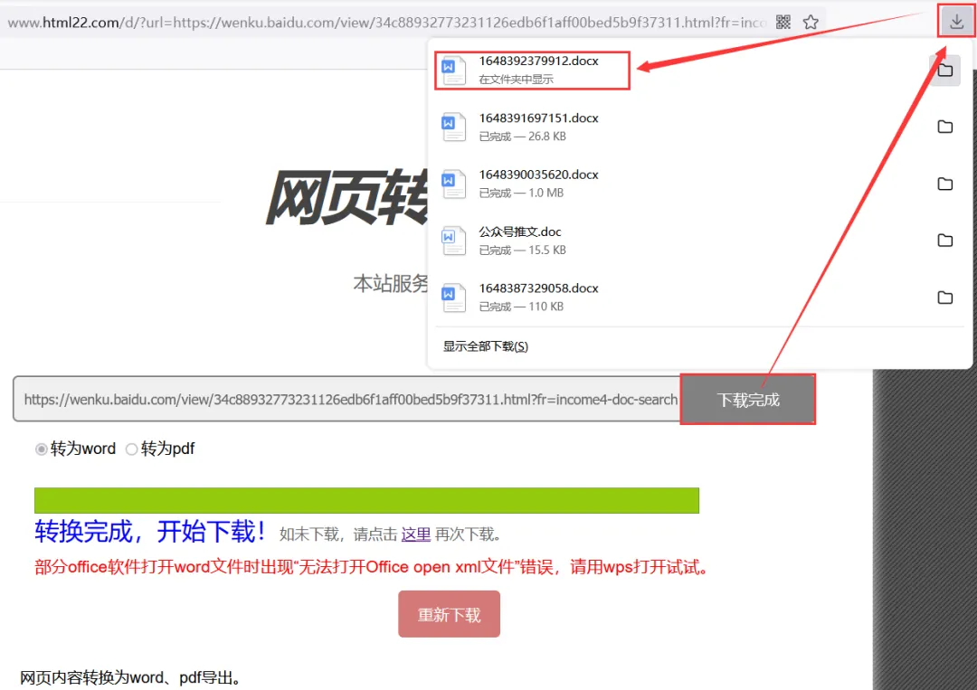 4.等待「下载完成」→点开浏览器右上角的「下载」图标→找到刚刚下载的文档即可。