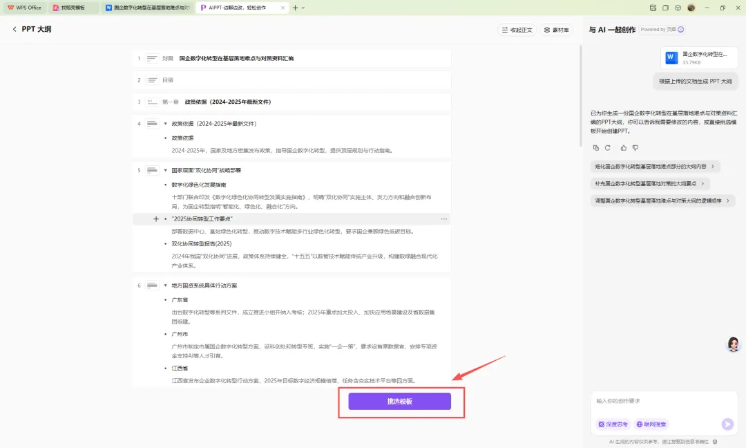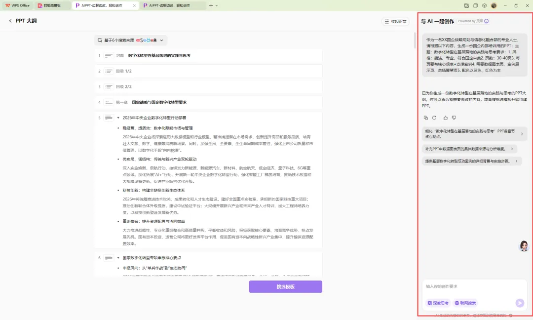 3.WPS AI会生成一份大纲,你可以根据输出的大纲是否满足要求,通过”右侧的对话框“进行完善修改,直到确定大纲。