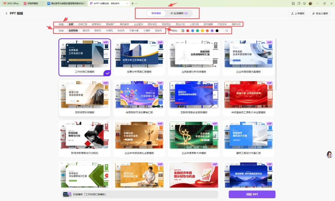 5.进入模板选择界面后:(1)可根据场景、风格和颜色筛选适合的模板。通常会优先根据公司的宣传标识颜色确定主色,然后根据适用场景或风格选择,挑选适用的就好。