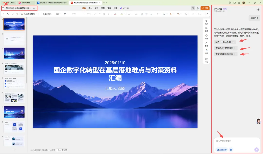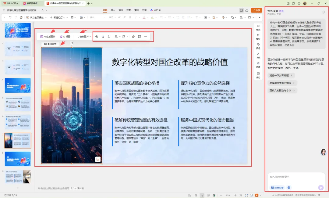 6.无论选择哪一种方式,WPS AI都会自动生成图文并貌的PPT,可以根据生成是否符合自己的需求,选择右侧“WPS 灵犀”功能区的提示或下方”对话框“深度思考进行调整。调整满意后,点击左侧上方”