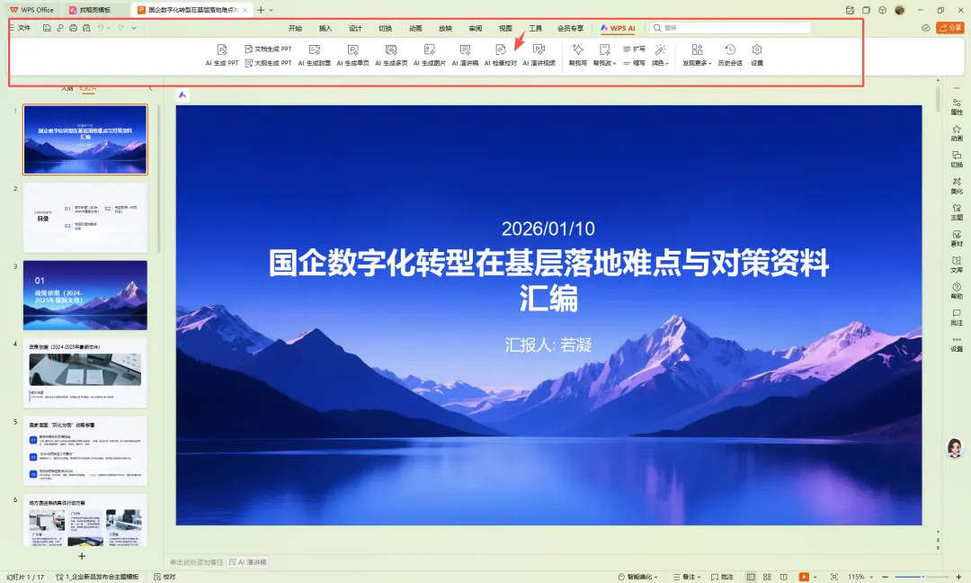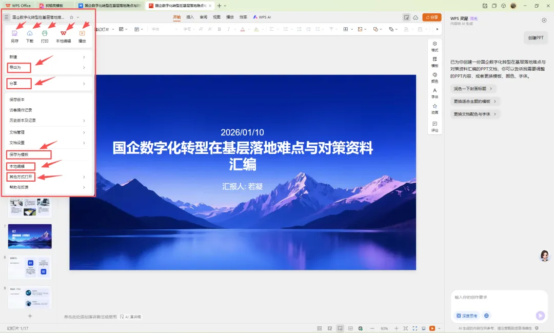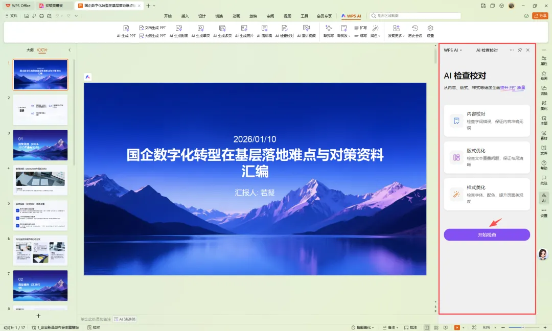 7.如需进一步优化可在“本地编辑”或”重新打开本地保存的文件“进行。在这里提示大家,WPS AI对PPT也有“AI检查校对”“AI演讲稿”等功能,根据功能菜单字面意思,大家可以根据需求使用。此处仅演示2项功能: