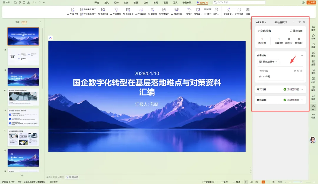 (1)AI检查校对:WPS AI会自行对PPT文件的内容、版式和样式进行美化。根据校对提示,选择接受或忽略即可。