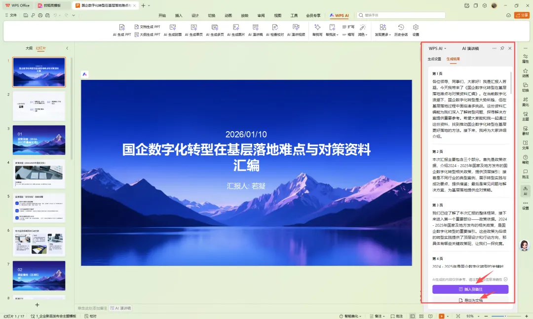 (2)AI演讲稿:WPS AI 会自动根据PPT内容生成演讲稿,在右侧框内还可以进一步修改、完善,直接“插入到备注”使用,或“导出为文档”进一步优化后提供给演讲人。