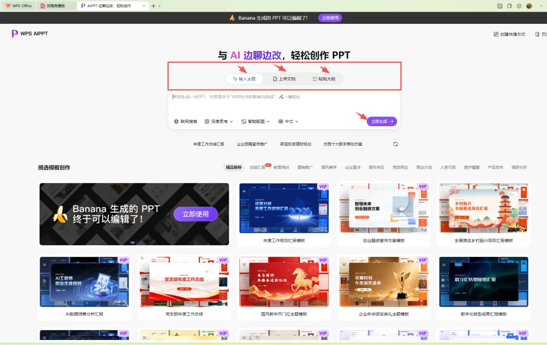2.点击进入创建界面,会看到“输入主题”“上传文档”和“粘贴大纲”三个选项。
