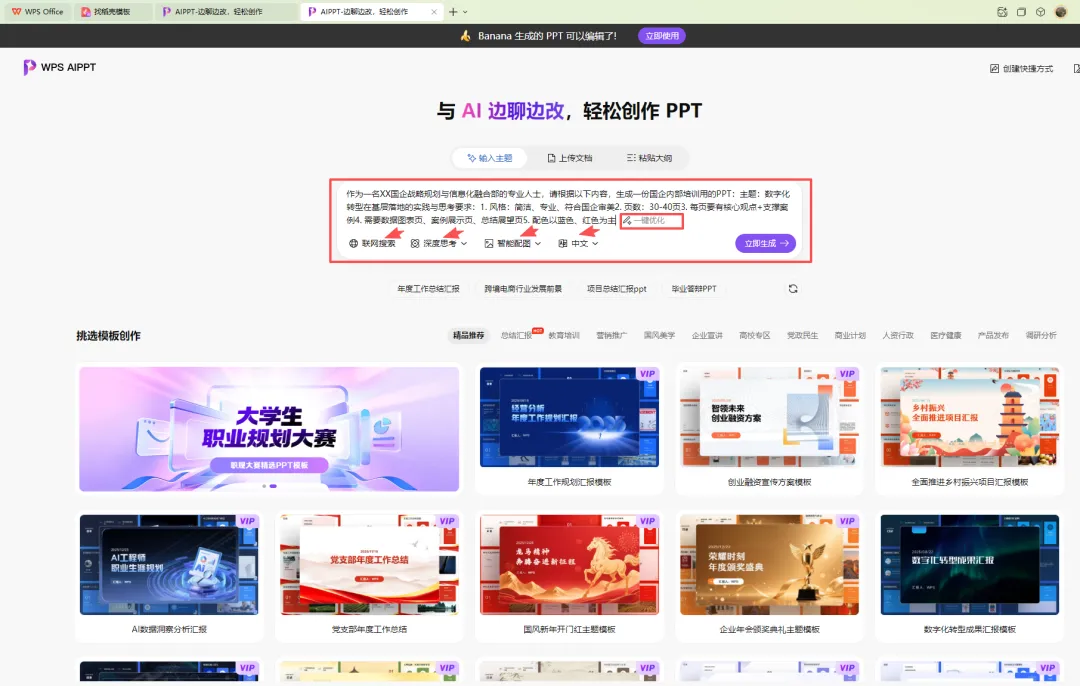 【参考提示词】如下,写好的提示词还可以利用WPS AI自带的”一键优化”进行优化,根据自身需求选择是否需要”联网搜索“”深度思考“”智能配图“和”中/英文“等模式。