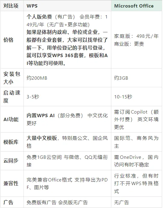 我已经很多很多年不用office,以下对比和分析一部分来源于搜索和AI,对”Office也有AI功能啊,为什么非要选WPS?“的疑问,以下内容仅供参考: