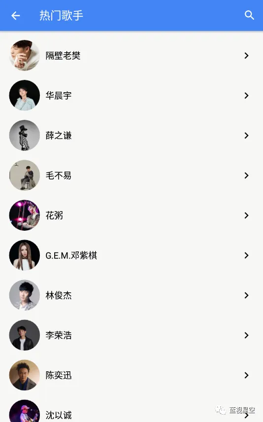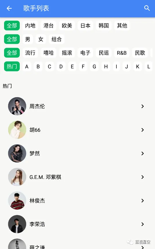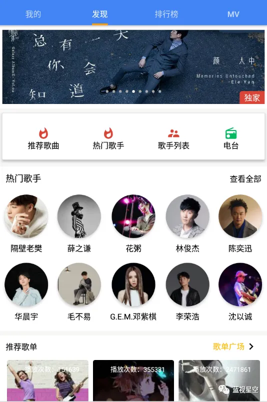 发现分类里有推荐歌曲,热门歌手,歌手列表,还有音乐电台,不过蓝叔测试电台是打不开的