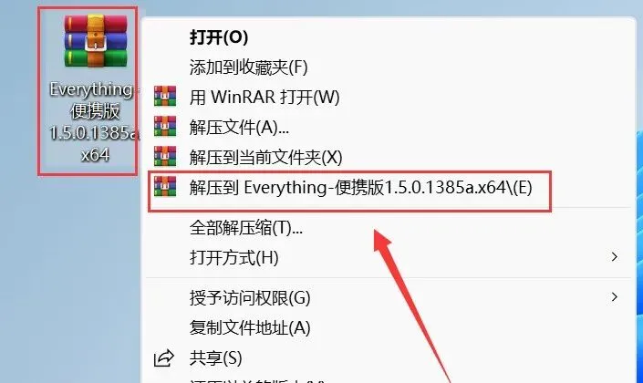 1.解压安装包:鼠标右击【Everything-便携版】压缩包,选择电脑上安装的解压软件,点击【解压到Everything-便携版】。