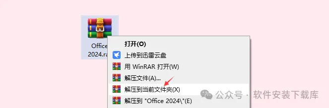 1.找到下载好的Office永久免费版安装包,解压安装包:①鼠标右击【Office 2024】压缩包②选择”解压到当前文件夹”