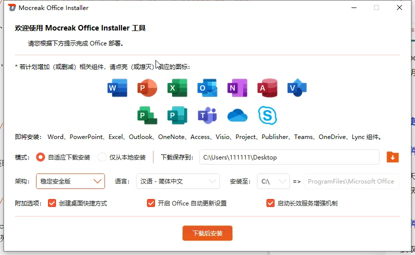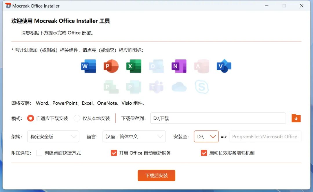 Mocreak 会根据操作系统版本自动下载合适的最新正版 Office 。