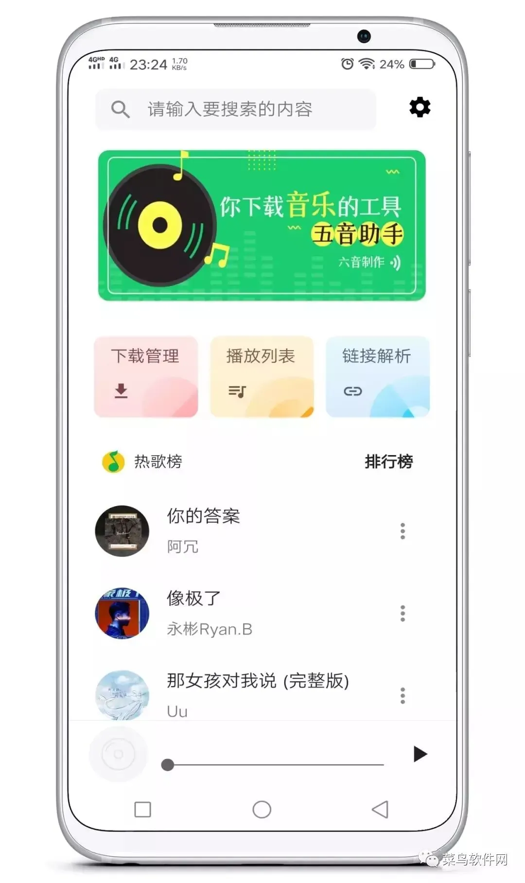 今天菜鸟团队继续给大家分享一款极简风格的手机音乐下载软件,软件界面非常的小清新,支持四个主流的音乐平台音源选择,下载时可选无损音乐;