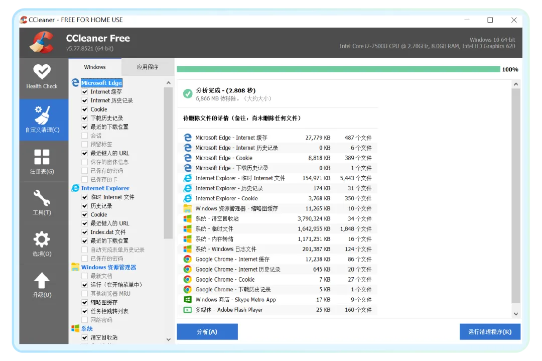 1、缓存垃圾清理。在“自定义清理”中点击“分析”,等分析出所有的缓存、垃圾后点击“运行清理程序”即可。