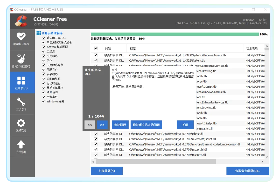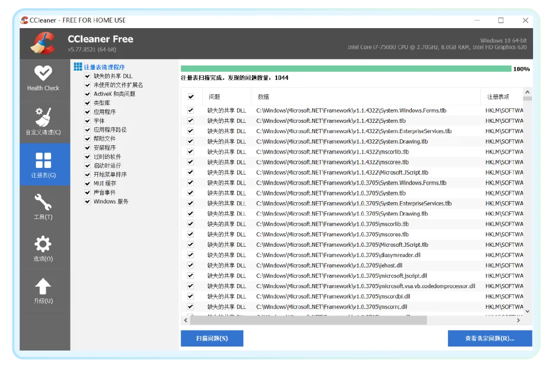 2、清理注册表。注册表是电脑记录软件信息的重要程序,但也会有很多垃圾。在“注册表”中点击“扫描问题”,扫描后点击“查看选定问题”。