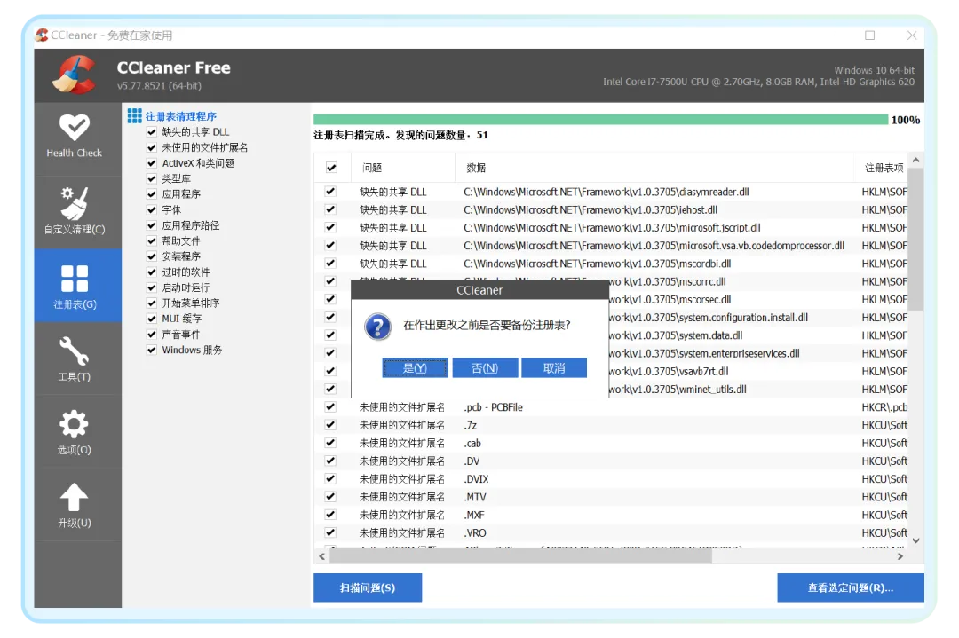 对“在做出更改之前是否要备份注册表”这个问题选“否”。
