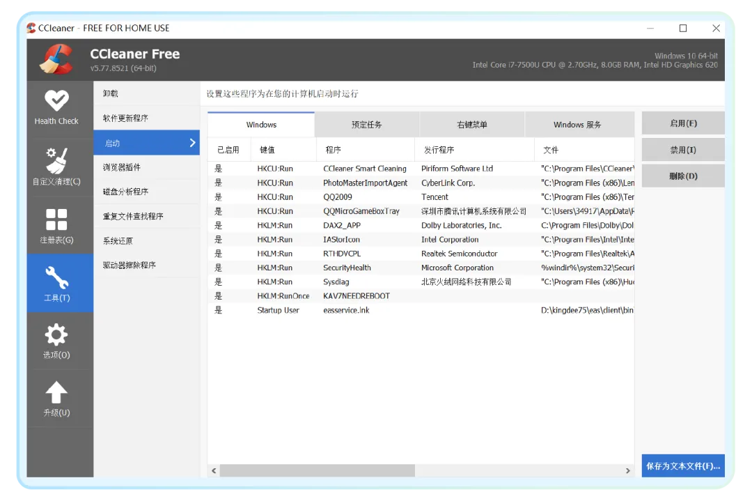 3、管理软件自启动。除了系统和杀毒软件,大部分自己安装的软件都可以禁止自启动。在“工具-启动”中,可以看到所有开机后就自动打开的软件,选中后点击“禁用”即可。